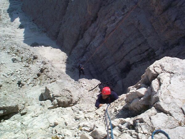 Závěrečný úsek na Cima Picola. Za Pepou vůdce v převislém slanění.