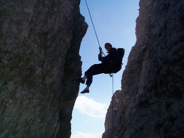 Slanění do sedla mezi Cima Picola a C. Grande (= místo nástupu).