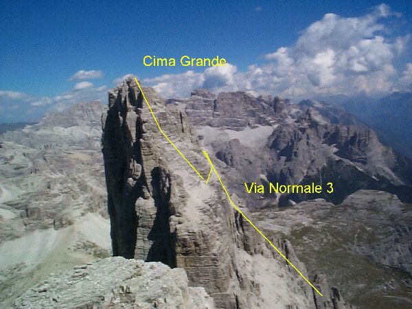 Cima Grande z vrcholu Cima Ovest. (z oblasti blízko vrcholu sejmuta šedá barva pro pozadí této části stránek)