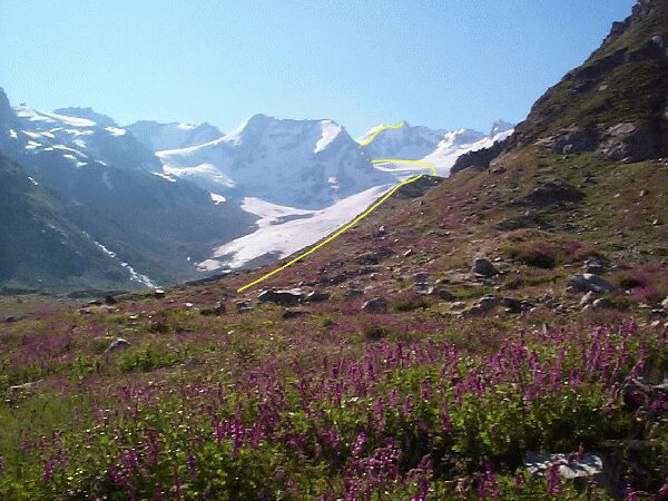 Trasa výstupu do sedla Gumači a na vrchol Gumači. Z Z. Gostinicy. [2659 m n.m.]