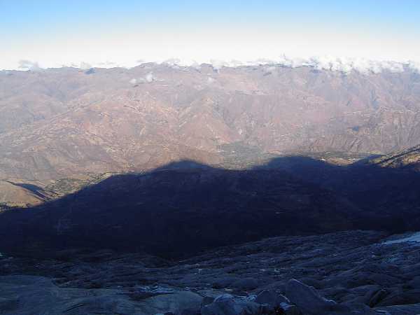 Stín Huascaránu nad údolím Rio Santa. Jižní vrchol vlevo, severní vpravo. Bílá tečka vpravo od severního vrcholu, na hranici stínu, je hřbitovní pahorek v Yungay, kde se při zemětřesení v roce 1970 před lavinou zachránilo 240 lidí, ostatních 18 tisíc obyvatel Yungay zahynulo.